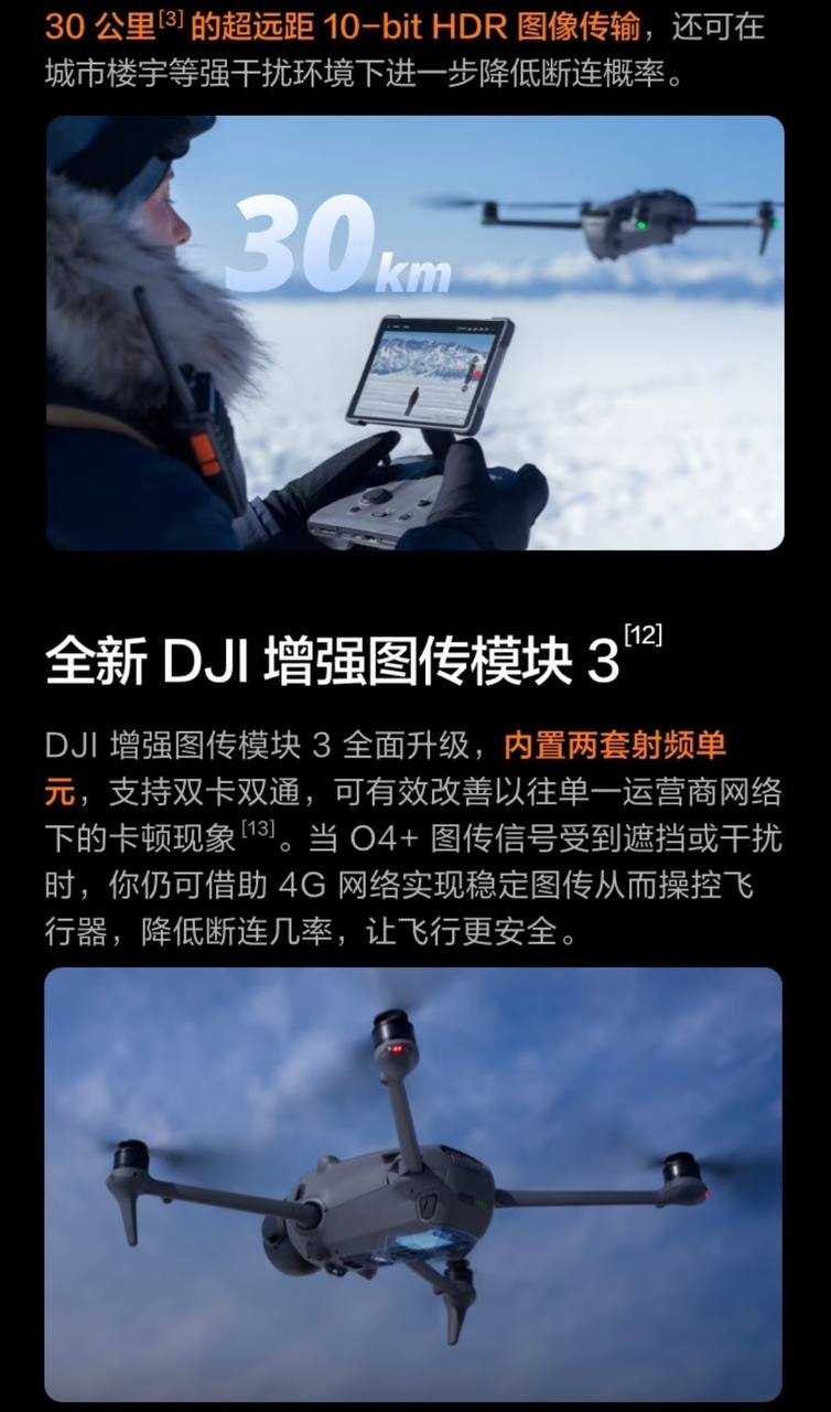 Employing the DJI 04+ image transmission system, it achieves ultra-long-range 10-bit HDR image transmission up to 30 kilometers, offering more stable signal, stronger anti-interference capabilities, and superior image quality.