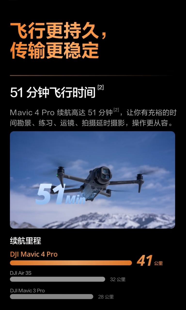 The DJI Mavic 4 Pro features comprehensive upgrades in its camera system, visual perception system, flight performance, and image transmission system. Key improvements include: